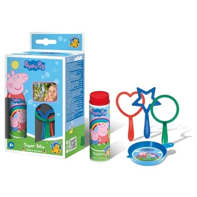 Peppa Pig Design Super Mix: The Pustefix Peppa Pig Superi-Mix offers an exciting play experience for children with their favourite Peppa Pig figure; the set comes in an original Peppa Pig design and provides extra fun when making soap bubbles Creative bubble ring shapes: the Superi mix contains three unique blow ring shapes in heart, circle and star shape; These creative designs allow children to create a variety of soap bubbles of different shapes and sizes, providing a varied and fun experience Liquid bowl: in addition to the blow rings, the Superi-Mix also includes a liquid tray specially designed for use with the Pustefix bubble liquid; this bowl makes it easier to dip the bubble rings and ensures an even distribution of the liquid 70 ml Pustefix liquid: the tin of the Superi-Mix contains 70 ml of original Pustefix bubble liquid, which ensures high-quality and long-lasting bubbles; the liquid is child-friendly and guarantees safe and fun play Ideal for maximum fun: with the three mini bubble rings in different shapes - circle, heart and star - the Superi Mix always offers maximum bubble fun with Pustefix; this set is ideal for children's birthdays, family activities or just for playing in the garden, Manufacturer: Carrera Toys GmbH