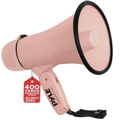 Pyle 20W Megaphone Bullhorn Portable, Automatic Siren & Adjustable Volume,Projection Range Up to 400 Square Yards, Aux Input, Talk, Siren, Music, Whistle, Record, Shoulder Strap (Pink)