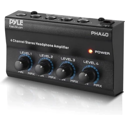 POWERS 4 HEADPHONES: The Pyle 4 channel amplifier headphone is a monitor distribution system that powers practically any headphones - up to four pairs at the same time. This allows four people in your studio to listen to the main mix while recording INDEPENDENT VOLUME CONTROLS: Each listener can determine their own volume level using the dedicated output level controls. 4 channel amp Features independent channel rotary volume knob control for each listener’s convenience ¼” TRS OUTPUT JACKS: This 4-channel bluetooth amp is equipped w/ 4 ¼” stereo headphone TRS output connector jacks which allow you to control up to 4 headphones at once. Also equipped w/ ¼” TRS source input connector jack for your Pyle Pro mixer SUPERIOR AUDIO QUALITY: The 4 channel amplifier home audio speaker amp maintain the highest sonic quality even at maximum volume levels. This 4 channel stereo amplifier has ultra-low noise amplifiers are included for outstanding audio performance COMPACT SIZE: The amplifier 4 channel bluetooth home amplifier features a mini compact size and measures 4.07” x 1.18” x 2.24”, easy to carry and use on the road. Perfect for both on-stage and in-studio performances or applications