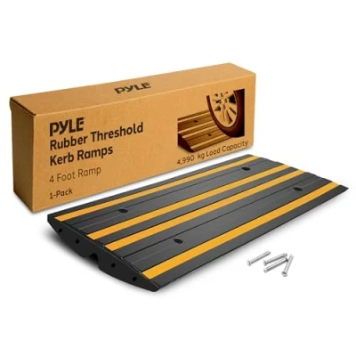 Pyle 4 ft. Rubber Curb Ramp, Non Slip Threshold Single Ramp for Driveways & Sidewalks, Marine Grade Waterproof, Yellow Reflective Strips, Expansion Screws Included, 48.0’’x 16.0’’ x 2.6’’ Inch