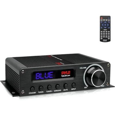 100-WATT POWER: The Pyle 5.1-channel Hi-Fi amplifier delivers an impressive 100 watts of peak power to enhance your entertainment system. Enjoy low distortion and acoustically accurate audio reproduction, providing crisp, high-quality sound from your mini Hi-Fi amplifier. BLUETOOTH CONNECTIVITY: This compact Bluetooth amplifier features seamless wireless music streaming, making it easy to connect with today’s latest devices, including smartphones, tablets, and laptops. Experience hassle-free pairing for a smooth listening experience. VERSATILE INPUT OPTIONS: The professional mini amp supports a variety of external devices. It includes an RCA subwoofer output for active (powered) subwoofers only — passive subwoofers are not supported, AUX RCA L/R audio inputs, 2 inputs, and an FM radio antenna input, plus 5 sets of spring-loaded speaker terminal connectors. FRONT CONTROL PANEL: Designed for ease of use, this mini amplifier features a built-in LCD display and clear buttons for functions such as standby, tuner (-/+), surround, mute, and input selection. A rotary control knob allows for precise volume adjustments. EQUALISER CONTROLS: This multifunctional 5.1-channel hi-fi amplifier includes intuitive buttons and rotary knob controls for tailored audio adjustments. The package also comes with a 12V adapter and remote control for convenient operation from a distance.
