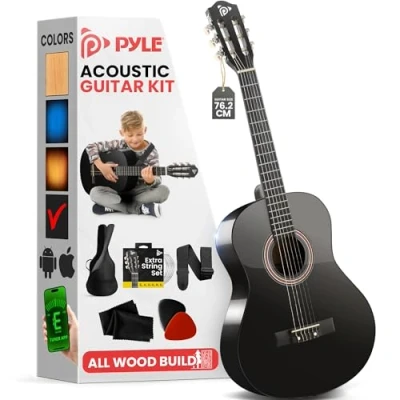 Pyle Beginner Acoustic Guitar Kit, 1/4 Junior Size All Wood Instrument for Kids, Adults, 30 Black Matte