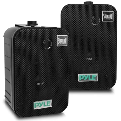 AMPLIFY YOUR HOME: Pyle’s 400W dual indoor/outdoor wall-mount speaker system provides high-quality audio in your home, garden, pool, or patio. Includes (2) 13.3 cm 4-ohm mountable speakers. QUICK-CONNECT TERMINALS: Weatherproof speaker system with a capacitor crossover network for clear sound. Easily connect wires using quick connect/disconnect speaker terminals. PROTECTED FROM ELEMENTS: Removable rustproof speaker grill prevents corrosion and sound distortion. Marine-grade waterproof construction makes it safe for wet environments. SUPERIOR SURROUND SOUND: Features 13.3 cm aluminium cone woofer with a 1.8 kg magnetic structure, 2.5 cm Mylar tweeter, and bass reflex vent for enhanced bass response. UNIVERSAL MOUNTING: Housed in a heavy-duty grill cabinet, the speakers can be mounted horizontally or vertically on a wall, corner, or ceiling. Includes (2) adjustable angle U-mounting brackets.