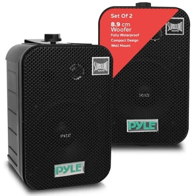 AMPLIFY YOUR HOME: Pyle’s 300W dual indoor/outdoor speaker system delivers high-quality sound for your home, garden, pool, or patio. Includes (2) 8.89 cm 4-ohm mountable speakers. QUICK-CONNECT TERMINALS: Weatherproof speaker system with a capacitor crossover network separates channels for clear sound. Easily connect wires using the quick-connect/disconnect terminals. PROTECTED FROM ELEMENTS: Features a removable rustproof grill to prevent corrosion and sound distortion. Marine-grade waterproof construction makes it safe for use in wet areas. SUPERIOR SURROUND SOUND: Black waterproof recessed speaker system with 8.89 cm aluminium woofer, 2.54 cm Mylar tweeter, and bass reflex vent for enhanced bass response. UNIVERSAL MOUNTING: Rugged, heavy-duty grill cabinet enclosure. Can be mounted horizontally or vertically on walls, corners, or ceilings. Includes (2) adjustable-angle spring-loaded U-mount brackets.