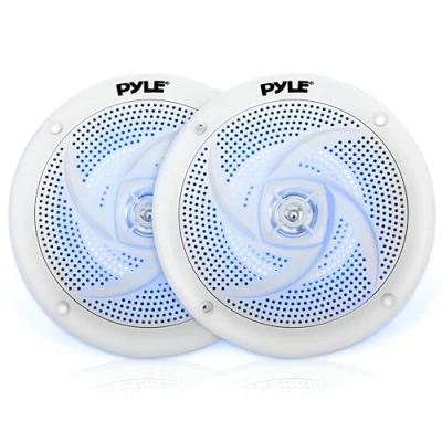 WATERPROOF – Includes two marine speakers with a 102 mm standard size. Designed with weather-resistant construction to handle heavy splashes and outdoor conditions on boats and other vehicles. AUDIO SPEAKER SYSTEM – These marine speakers deliver 2-way full-range audio for clear stereo sound with 100 W max power output, ideal for boats, jet skis and outdoor use. BUILT-IN LED LIGHTS – Features bright blue LED illumination for added excitement on watercraft. Offers 90 Hz–18 kHz frequency response, 4 Ohm impedance and 90 dB sensitivity. LOW PROFILE DESIGN – Slim, low-profile build allows easy installation on boats, marine craft and off-road vehicles. The clean white finish adds a stylish touch to any setup. EASY INSTALLATION – Simple to fit with the included 3 m wiring. Universal OEM replacement size with 132 mm total speaker diameter and 229 mm mounting depth for versatile use.