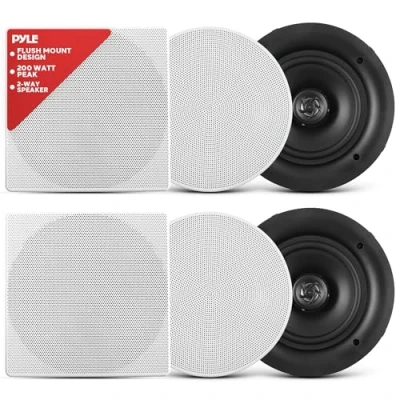 60Hz - 20kHz FREQUENCY RESPONSE: The Pyle 16.5 cm speaker system features a 1.27 cm polymer tweeter, 8-ohm impedance, and 200W power handling, delivering clear and powerful sound. 2-WAY MOUNT SPEAKER: This 16.5 cm stereo speaker offers two installation options. Built with a polypropylene cone, rubber edge, and crossover network, it’s perfect for custom setups. FLUSH MOUNT DESIGN: Designed for in-wall or ceiling installation with a sleek flush mount. Includes cutout dimensions of 20 cm diameter x 7.9 cm depth and stain-resistant round/square grilles. 200W PEAK POWER: Engineered for crisp, responsive audio with a wide sound range. The durable design ensures long-lasting performance for home or commercial use. 24.1CM x 8.6CM CUTOUT SIZE: Elegant white finish ideal for ceilings or wall enclosures. Secured with a sturdy bracket supporting up to 3.06 kg. Overall dimensions: 24.1 cm diameter x 8.6 cm depth.