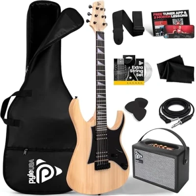 Pyle Prog Rock EG Series Electric Guitar with Amp Kit, 39" Full Size Dual Humbucker Pickups, Low Profile Neck and Solid Paulownia Body, Premium Accessory Kit Included (Natural Gloss)