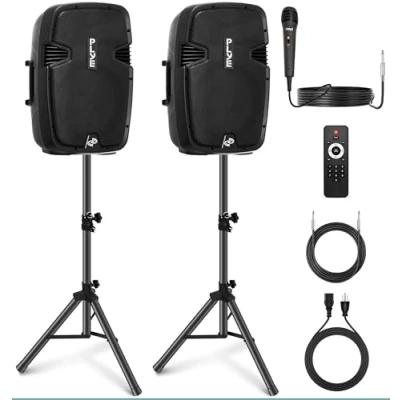 Pyle Wireless Portable PA Speaker System 1800W High Powered Bluetooth Compatible Active + Passive Pair Outdoor Sound Speakers w/USB SD MP3 AUX 35mm Mount, 2 Stand, Microphone, Remote PPHP1249KT