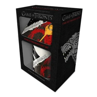 Surprise any Game Of Thrones fanatic with this Stark And Targaryen Mug Coaster & Keychain Gift Set. Perfect for adding to Christmas stockings or giving as birthday gifts.. This branded gift box contains an 11oz ceramic mug and a cork-backed coaster featuring instantly recognisable Stark and Targaryen crests and designs. Plus a hand of the king shaped PVC keychain.. Game Of Thrones Stark And Targaryen Mug Coaster & Keychain Gift Set. Ideal stocking filler or birthday gift. Microwave and dishwasher safe. 11oz ceramic mug: H x 10, W x 11cm. PVC keychain: L x 7cm approx. Cork coaster W x 10cm. Supplied in a cardboard gift box