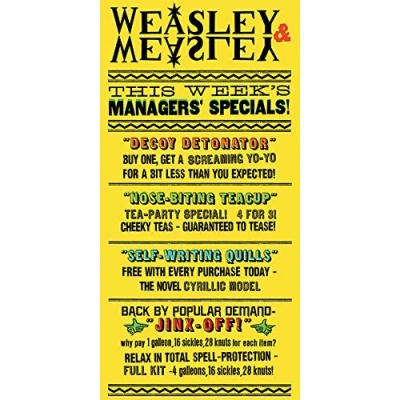 STUNNING CANVAS WALL ART - a beautiful reproduction, ready to hang to bring a touch of Harry Potter magic to a bedroom, hallway or living room SHOWS AN AUTHENTIC REPRODUCTION OF THE WEASLEY & WEASLEY JOKE SHOP POSTER – promoting their pranksters specials on sale at number 93 Diagon Alley, the cobbled, wizarding shopping street in London, and founded by Fred and George Weasley FRED AND GEORGE WEASLEY – fun loving identical twins and older brothers of Ron Weasley, one of HARRY POTTER’s best friends at Hogwarts School of Witchcraft and Wizardry GREAT GIFT FOR HARRY POTTER FANS OF ALL AGES - anyone who loves the tales of the famous boy wizard will enjoy this canvas print that conjures up the magical world Harry lives in GENUINE HARRY POTTER MERCHANDISE - inspired by the films starring HARRY POTTER and his friends Hermione Granger and Ron Weasley and approved by Warner Bros for a real piece of the wizarding world