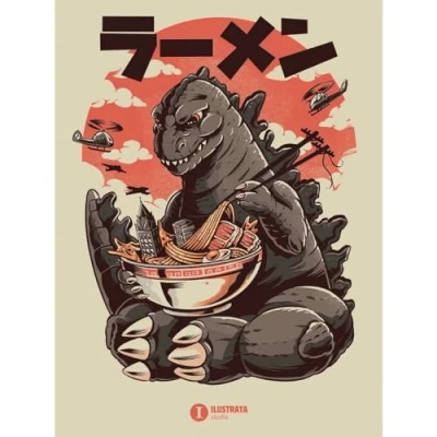 ORIGINAL WALL ART READY TO HANG - printed and hand finished in the UK, this Ilustrata canvas board for your living room, bedroom or hallway to add some quirkiness to your home SHOWS 'KAIJU RAMEN' DESIGN - large monster uses two telephone poles as chopsticks to tuck into his tasty oversized bowl of ramen with a side of skyscraper HANG IN YOUR LIVING ROOM OR HOME OFFICE – this Japanese-inspired artwork is perfect to hang with other Ilustrata prints and wall pictures or by itself to bring even the plainest wall to life GREAT GIFT FOR ILUSTRATA FANS OF ALL AGES - anyone who loves the wacky, retro illustrations of Bruno Rodrigues, David Faraum and Victor Kahn will enjoy this imaginative canvas GENUINE ILUSTRATA MERCHANDISE - based on an original Ilustrata artwork and approved under licence from the world famous Brazilian design studio