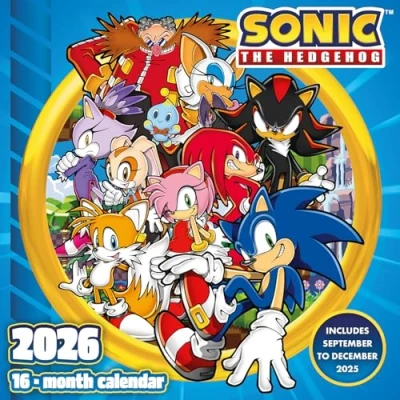 🦔 Classic Sonic the Hedgehog artwork for every month of 2026 📅 30cm x 30cm square calendar – display in home, office, or bedroom 🎨 Printed with bright colours and crisp detail 📝 Monthly date grids for organisation and scheduling 📦 Collectible calendar for fans of Sonic and retro gaming