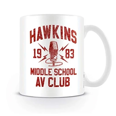 FULL SIZED 11OZ DISHWASHER SAFE MUG - ceramic porcelain, perfect for tea, coffee, warm milk or hot chocolate and also makes a great ice cream bowl or pen holder PRINTED ON BOTH SIDES - with logo of Hawkins Midde School Audio Visual Club, run by the school science teacher, Mr Scott Clark AV CLUB 1983 - Mike, Will, Dustin and Lewis were all members and used it as a place to discuss supernatural events happening in the town GREAT GIFT FOR ANY STRANGER THINGS FAN - anyone who is mesmerised by the sinister world of Eleven and her friends will enjoy this distinctive mug GENUINE STRANGER THINGS MERCHANDISE - inspired by the spooky series featuring Eleven, Dustin Henderson, Mike Wheeler and Lucas Sinclair and officially approved by Netflix