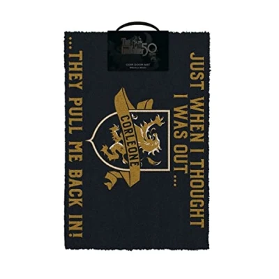 DURABLE FULL SIZED WELCOME MAT - high quality front door mat made from coconut fibre matting and a robust non-slip backing, to use indoors or out JUST WHEN I THOUGHT I WAS OUT...' - '...they pull me back in', the famous quote said by Michael Corleone, is a perfect way to welcome your friends and family back to your place again WELCOME MAT ALSO FEATURES THE CORLEONE CREST - part of the family coat of arms, showing a majestic gold lion on its hind legs with its tail in the air GREAT GODFATHER GIFTS FOR THE GODFATHER FANS - anyone who enjoys the rise and fall of the Corleone crime family will love this evocative coir doormat that evokes scenes of the troubled mobsters GENUINE THE GODFATHER MERCHANDISE - inspired by the Oscar-winning trilogy starring Vito Corleone and Michael Corleone and approved by Paramount Pictures as an authentic piece of movie memorabilia