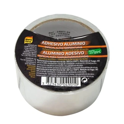 Aluminium adhesive tape, 40 microns, resists up to 110 °C. 10 metre roll x 50 mm x 40 μm thick. Acrylic adhesive specially indicated for high temperatures. Suitable for ensuring a connection of ducts in: ventilation, air conditioning, vmc, heat recovery In insulation: joining insulating panels, heat recovery ducts, removal of thermal bridges and thermal insulation, Weight: 0.220462262 pounds, Manufacturer: PYROFEU