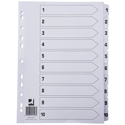 This Q-Connect 1-10 numbered index divider provides a clear and simple filing solution for your everyday office needs. The front index sheet provides space for labelling to make referencing your notes quick and easy. Made from plain white board with clear tabs that are Mylar-coated for extra reinforcement, this index comes with pre-printed tabs (1-10) and is multi-punched to fit standard A4 lever arch files or ring binders 10-part divider numbered 1-5 Made from strong white board Made from strong white board Index cover sheet for labelling and cross-referencing Multi-punched to fit standard A4 ring binders and lever arch files. Format: A4 (210x297mm) White with clear tabs