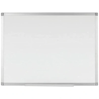 Size: 1200x900mm. Non-magnetic whiteboard for light use. Coated chipboard surface. Double-sided with plain and faint grid options. Slim anodized aluminium frame. Includes clip-on plastic pen tray. Easy installation with included wall fixing kit.