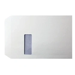 Plain pocket envelopes. 100gsm paper. Window size: 40 x 105mm. Window position: 24mm in, 213mm up. Self seal closure. Size: C4 (324 x 229mm). Colour: White. Pack of 250.