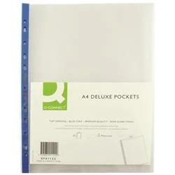 Q Connect Delux Punched Pocket Top Opening Blue Strip A4 Clear (Pack of 25) KF01122