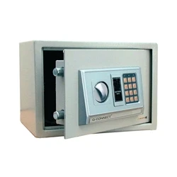 Electronic locking security safe. 5mm door and 2.5mm body thickness. Concealed key override. User combination code and emergency code. 3 minute auto lock if code incorrectly entered 3 times. Low battery warning (batteries included).