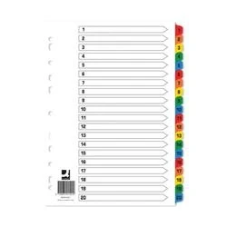 Set of 10 dividers numbered 1-20. Made from strong white board. Reinforced tabs and holes for durability. Index cover sheet for labelling and cross-referencing. Multi-punched to fit most A4 ring binders. 160gsm. Colour: White with multicoloured tabs.