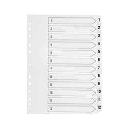 12-part indexed dividers. Pre-printed with 1-12 numerals. Made from durable polypropylene. Index sheet provided to help label up your filing. Hole punched to fit standard A4 binders, files and folders.