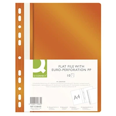 Q-Connect KF15665 plastic file folder, A4, orange, pack of 10. Dimensions: 225 x 305 mm, A4, colour: orange. For office and school use The flexible file folders made of ecological polypropylene (plastic/plastic) - pack of 10 11 holes for attaching to the folder (11-hole punched (Euro holes)) Transparent front - PP thickness: 120 µm; Coloured back - Thickness: 170 µm Holds approx. 200 sheets (2 cm) for A4. Not for clamping. Interchangeable, double-sided edging tape. With the green dot - participation in the recycling and recycling system, which results from the provisions of Polish and EU law