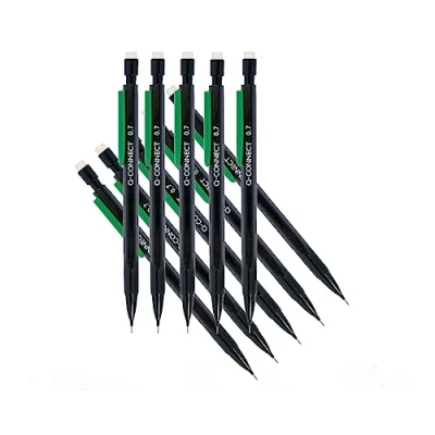 This high quality, easy to use Q-Connect Mechanical Pencil has a built-in eraser and pocket clip for convenience in use, the pencil contains 0.7 mm HB lead for writing, sketching, and drawing at home, work, or school, this highly economical pencil is supplied with 3 refill leads for long lasting use, this pack contains 10 pencils with black barrels Quality mechanical pencil for writing, sketching and drawing Lead extends at the push of a button 0.7 mm HB lead Pocket clip and built-in eraser Supplied with 3 refill leads Barrel colour: black Pack of 10