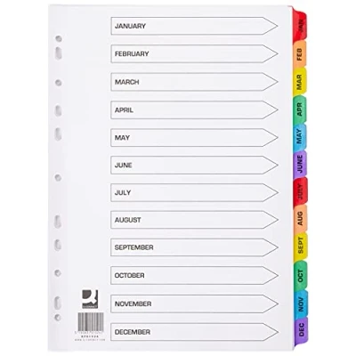 This Q-Connect January-December index divider provides a clear and simple filing solution for your everyday office needs. The front index sheet provides space for labelling to make referencing your notes quick and easy. Made from plain white card with multi-coloured Mylar tabs for extra reinforcement. This 12 part index comes with pre-printed tabs (January-December) and is multi-punched to fit standard lever arch files or ring binders 12-part divider marked monthly January-December Great for organising your papers into a logical order Punched to fit most standard A4 binders Multi-coloured for easy colour-coordination Index sheet for labelling and cross-referencing Mylar-coated tabs for long-lasting durability