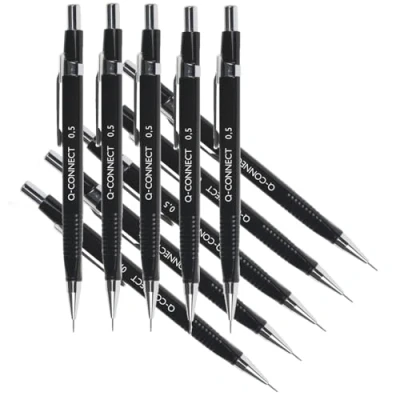 This high quality, easy to use Q-Connect Refillable Automatic Pencil has a built in eraser and pocket clip for convenience in use. The hard-wearing pencil has a robust stainless steel nib and comes complete with 4 HB 0.5mm polymer leads for refilling. This pack contains 10 pencils Quality automatic pencil for writing, sketching and drawing Lead extends at the push of a button Metal clip and built-in eraser Stainless steel nib Includes 4 lead refills Fine 0.5mm HB polymer lead Pack of 10