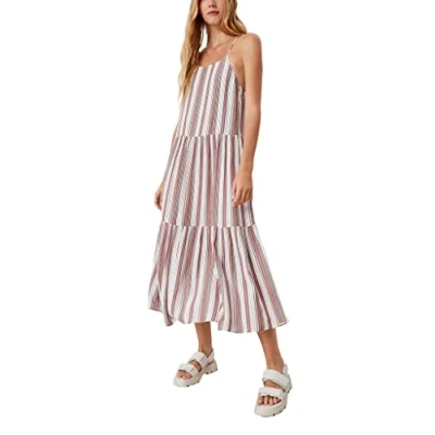 Regular fit Has a racer back, has a neckline on the back Made from woven fabric, in flowing quality With valances, with striped pattern Has thin straps