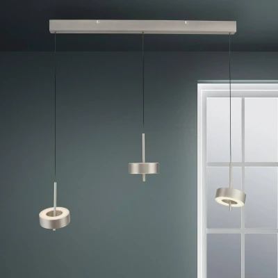 3-bulb LED pendant light Q-Rotate with adjustable lampshades - smart and controllable by remote control Functionally and visually, the Q-Rotate LED pendant light is in tune with the times. Three ring-shaped aluminium lampshades are each pivotably attached to a central rod and each houses an LED module. The light is emitted through satinised covers on the top and bottom of the rings. Thanks to Comfort Lift, the height of the pendant can be adjusted manually at any time, and a suitable Q remote control is included for switching, dimming and adjusting the colour temperature. In addition to free adjustment of the light, this also offers preconfigured options so that the perfect lighting is conveniently available for almost any situation. Alternatively, the Q-Rotate pendant light can be wirelessly integrated into ZigBee-based smart home systems (bridge required) in order to control it via app or voice command, depending on the configuration. Technical data/compatibility: - dimmable - adjustable colour temperature of the light from warm white to cool white - pre-configured scenes - memory function - switching of up to 20 individual Q-Leuchten or Q-Bulbs to a maximum of 3 groups with just one Q-Remote control (included) - ZigBee-capable - voice control via devices with integrated ZigBee hub (e.g. Echo 4th Gen., Echo Studio, Echo Show 10 3rd Gen) - Can also be conveniently controlled via app or voice command when integrated into a ZigBee-based smart home system Note: A bridge is required for connection to a smart home system or app control; this is not included in the scope of delivery.