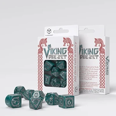 The color theme for this set is a stormy background with silver engravings The set consists of 7 polyhedral dice, with a rounded D4 Ideal Product, Manufacturer: Q-Workshops