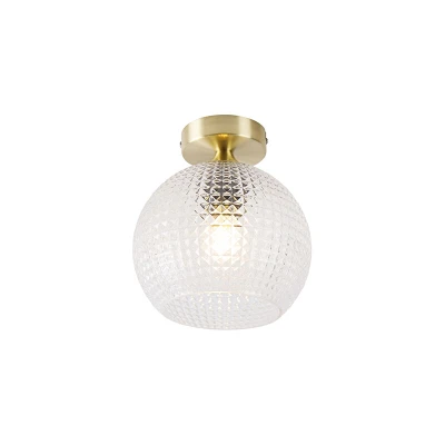 General description The QAZQA Art Deco Ceiling Lamp in Brass with Clear Glass - Sphere is a stunning addition to any interior. Its elegant design features a glass structure that creates a cheerful lighting effect on the walls when illuminated. This lamp is perfect for enhancing the ambiance of your hall, living room, or bedroom. Technical specifications Material: Glass and Steel with Brass finish Total diameter: 20 cm Height: 21.5 cm Mounting plate diameter: 10 cm Mounting plate height: 2.5 cm Glass shade diameter: 20 cm Glass shade height: 16.5 cm Bulb holder: E27 Max wattage: 1 x 25 W Voltage: 220V/230V Protection class: IP20 Dimmable: Yes (dimmer not included) Lightsource: Exclusive Compatibility and accessories Compatible with Incandescent, Halogen, LED, and Energy-saving bulbs Light source must be ordered separately Usage This ceiling lamp is suitable for various living spaces including indoor lights, dining rooms, offices, kitchens, bedrooms, stores, showrooms, and living rooms.