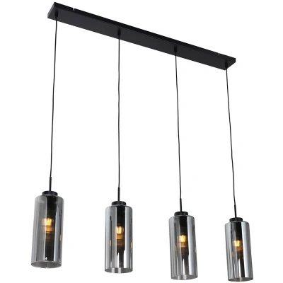 General description Meet Pendant Light Laura, an indispensable showpiece for lovers of Art Deco interiors! This striking lamp features a rectangular black mounting plate with four adjustable light points, surrounded by vertical ribbed smoke glass shades. Pendant Light Laura is the ultimate addition to your interior, a real eye-catcher that you don't want to miss! Technical specifications Dimensions: 100 cm (length) x 10 cm (width) x 2.5 cm (height) Maximum height adjustment: 160 cm Bulb holder: E27 Maximum wattage: 4 x 40 W Voltage: 230 V Connecting voltage: 220V/230V Protection class: IP20 Dimmable: Yes (dimmer not included) Lightsource: Exclusive Compatibility and accessories Suitable for: LED bulbs Usage Ideal for indoor spaces such as dining rooms, hallways, offices, kitchens, bedrooms, stores/showrooms, and living rooms. Other information