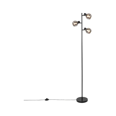 Qazqa Art Deco Floor lamp Black 3 Light with Smoke Glass Vidro Suitable for LED E14 Living Room I Bedroom