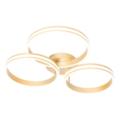 General description Enhance your interior with the QAZQA Ceiling Light Brass, featuring a modern design with three luminous circles that provide a pleasant distribution of light. This stylish ceiling light is made from aluminum, plastic, and steel, finished in a beautiful gold color, making it a perfect addition to any room, including studies, dining rooms, and hallways. Technical specifications Diameter: 74 cm Height: 18 cm Mounting plate diameter: 20 cm Mounting plate height: 4 cm Light output: 1920 lumens Color temperature: 2700 Kelvin Max wattage: 3 x 45 W Voltage: 220V/230V Protection class: IP20 Bulb holder: non-replaceable LED Usage The Navara Ceiling Light is 3-step dimmable, allowing you to adjust the brightness using your wall switch to create the perfect atmosphere in your space. Other information