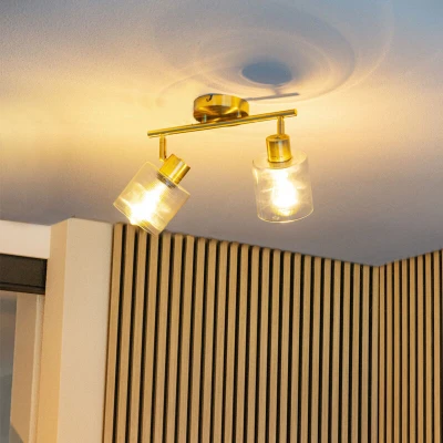 General description Meet Laura, the perfect ceiling spotlight that adds a touch of Art Deco to your interior. The elegant gold frame and the ribbed glass shades around the two light points give it a unique look. With a height of 20 cm and a length of 56 cm, Laura is an eye-catching showpiece in any room. Its adjustability allows you to position both light points as you wish. Complete Laura by ordering E27 light sources separately, as these are not included as standard. Technical specifications Height: 20 cm Length: 56 cm Bulb holder: E27 Max power: 2 x 40 W Voltage: 230 V Connecting voltage: 220V/230V Protection class: IP20 Dimmable: Yes (dimmer not included) Lightsource: Exclusive Usage Suitable living spaces for this lamp include: Indoor lights Dining room Hallway Kitchen Office / Work area Bedroom Store / Showroom Living room Other information