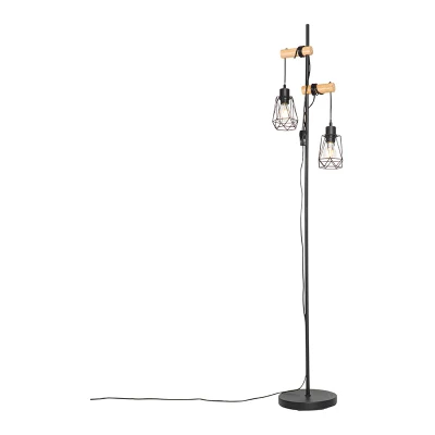 Qazqa Country Floor lamp Black with Wood 2 Lights Shade Dami Frame Suitable for LED E27 Light Steel Living Room I Bedroom