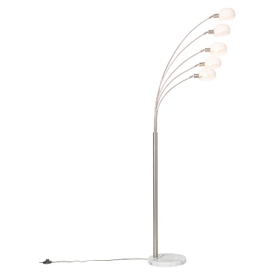 General description This modern 5-light floor lamp Sixties Marmo is a perfect fit for a designer interior. It is made of steel, glass, and marble, featuring a stylish steel finish. The opal glass lampshades create an atmospheric light effect, enhancing the ambiance of any room. Technical specifications Height: 198 cm Length: 129 cm Width: 28 cm Base diameter: 28 cm Base height: 3.5 cm Cord length: 250 cm Lampshade diameter: 13 cm Lampshade height: 7.5 cm Bulb holder: E14 Max power: 5 x 25 W Voltage: 220V/230V Protection class: IP20 Dimmable: Yes (dimmer not included) Compatibility and accessories Suitable for: LED, Incandescent, Halogen, Energy saving bulbs Usage Ideal for living room, study, bedroom, dining room, office/work area, and store/showroom. Other information