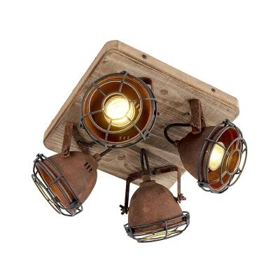 General description A tough spotlight, ideal for an industrial interior! The combination of rust-brown steel and a wooden mounting plate gives this lamp a distinctive industrial look. It is perfect for illuminating dark corners in your home and looks great in various spaces such as hallways and living rooms. Technical specifications Total height: 18 cm Wooden mounting plate dimensions: 27 cm (length) x 27 cm (width) Bulb holder: GU10 Maximum wattage: 4 x 25 W Voltage: 220V/230V Protection class: IP20 Dimmable: Yes (dimmer not included) Lightsource: Exclusive Compatibility and accessories Suitable for: Halogen, LED bulbs Light bulbs are not included and must be ordered separately Installation Can be mounted on the wall or ceiling Usage Ideal for indoor spaces such as dining rooms, hallways, kitchens, bedrooms, and living rooms Other information