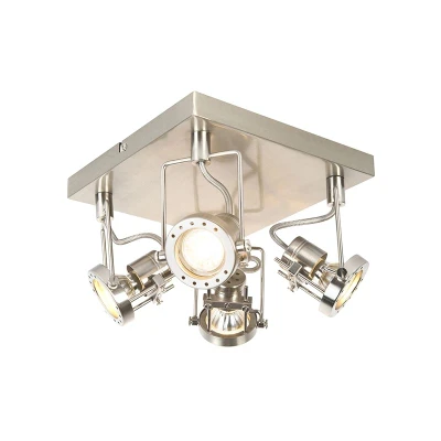 General description A beautiful steel ceiling or wall spot that provides pleasant and clear light distribution without sacrificing atmosphere. This lamp is a real addition to your interior, featuring a modern industrial design. It has four GU10 fittings and is supplied without light sources, so make sure to order them separately (max. 50W). The lamp is dimmable with an external dimmer (dimmer not included) and is perfect for various living spaces such as the kitchen, hallway, dining room, bedroom, and living room. Technical specifications Height: 15.5 cm Mounting plate dimensions: 24 cm (length) x 24 cm (width) Bulb holder: GU10 Max power: 4 x 50 W Voltage: 220V/230V Protection class: IP20 Lightsource: Exclusive Usage This lamp is suitable for indoor lighting and can be used in various rooms to create a stylish atmosphere. It is ideal for accent lighting in kitchens and hallways. Other information