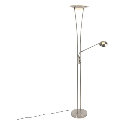 General description A very functional floor lamp with a reading arm, the QAZQA Modern Floor Lamp Steel Incl. LED with Reading Arm - Ibiza is designed for versatility and style. With a total height of 180 cm and a base diameter of 28 cm, this lamp is perfect for various living spaces including the dining room, office, kitchen, bedroom, and living room. It features an uplighter with a diameter of 30 cm and integrated LED lighting, providing a warm light output of 2700 Kelvin and 1600 lumens. Both the uplighter and reading arm can be operated separately and are dimmable, making it a great addition to enhance the mood of your interior. Technical specifications Height: 180 cm Base diameter: 28 cm Uplighter diameter: 30 cm Cable length: 175 cm Light output: 2700 Kelvin, 1600 lumens Max wattage: 1 x 23 W Voltage: 220V/230V Protection class: IP20 Compatibility and accessories Bulb holder: (non-replaceable) LED Suitable for: LED Lightsource: Inclusive Installation Includes a dimmer with cord