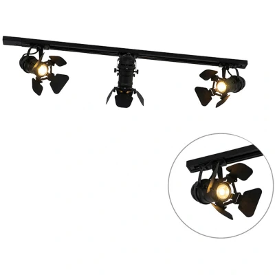 General description QAZQA Modern Track Lighting with 3 Black Spotlights 1-Phase - Iconic Movie is an industrial-style lighting solution featuring three black spotlights designed to enhance your interior with a home cinema feel. This stylish fixture is perfect for various living spaces, including dining rooms, offices, kitchens, bedrooms, showrooms, and living rooms. Technical specifications Dimensions: 100 cm (length) x 21 cm (width) x 25 cm (height) Bulb holder: GU10 Maximum wattage: 3 x 50 W Voltage: 220V/230V Protection class: IP20 Dimmable: Yes (dimmer not included) Lightsource: Exclusive Suitable for: Halogen, LED Compatibility and accessories Requires 3 GU10 light sources (not included) Installation Operates on phase-1 control, allowing all three spotlights to be turned on or off simultaneously with one button. Usage Can be dimmed with an external dimmer (not included). Other information