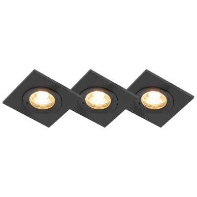 General description The QAZQA Set of 3 Bathroom Recessed Spotlights Black Square IP44 - Xena is the perfect solution to illuminate your bathroom with a modern touch. These stylish black square spotlights not only enhance the aesthetic of your space but also provide functional lighting that is splash-proof, making them ideal for bathroom use. Technical specifications Dimensions: Length and Width - 8 cm Cut-out size: 6.5 cm Depth: 12 cm Bulb holder: GU10 Max wattage: 3 x 50 W Voltage: 220V/230V Protection class: IP44 Dimmable: Yes (dimmer not included) Lightsource: Exclusive Compatibility and accessories Compatible with incandescent, halogen, LED, and energy-saving bulbs Light source required: GU10 fitting (max. 50W) Installation Comes complete with spring clips for easy clamping to the ceiling Usage Suitable for use in bathrooms and outdoor lighting Other information
