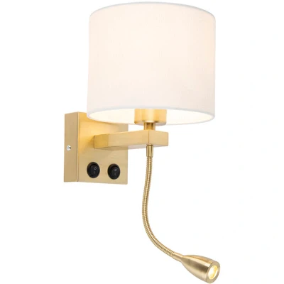 QAZQA Smart Wall Light Gold with White Shade Incl. Wifi A60 - Brescia Wow, what a cool Wall Light Brescia is! It fits perfectly in an Art Deco interior. The lamp is made of steel with fabric and is finished in white with gold. The total dimensions of the lamp are 42 cm high, 18 cm long and 21 cm wide. With a maximum of 806 lumens, the lamp provides a lot of light and is therefore suitable for functional lighting. The Wall Light is delivered to your home including an E27 light source. The light source has an average lifespan of 15,000 hours and consumes 7 watts. Extra handy: Brescia is smart and therefore remotely controllable with your smartphone or smart home system. The reading light completes this lamp. With Brescia you're always in good hands: you want this Wall Light in your home, right? Bulb holder: E27 . Max 1 x 1 W, 2 V Suitable for: Connecting voltage: 220V/230V Protection class: IP20 Lamp includes a dimmer,No, without cord and plug Lightsource: Inclusive The QAZQA Smart Wall