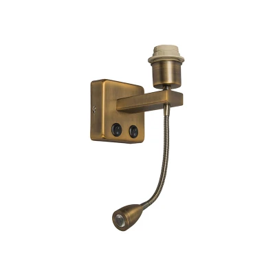 General description Stylish bronze wall lamp without a shade featuring a dual function. With separate switches, you can control the mood lamp and the functional LED reading lamp independently. The flexible reading arm allows you to direct the light where you need it, making it a perfect night lamp for the bedroom. The integrated LEDs in the reading arm are non-replaceable and provide warm mood lighting. Technical specifications Light output: 120 lumens Color temperature: 3000 Kelvin (warm light) Bulb holder: E27 Max wattage: 60 watts Depth: 20 cm Adjustable arm length: 22 cm Mounting plate dimensions: 10 cm x 10 cm Connecting voltage: 220V/230V Protection class: IP20 Non-dimmable Included light source: Yes Compatibility and accessories Suitable for: Incandescent, Halogen, LED, Energy saving bulbs Other information