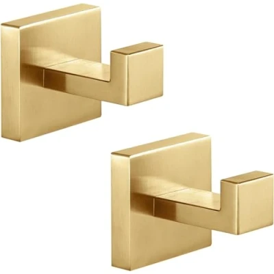 QNIIAED 2 Pcs Square Bathroom Towel Hook,Metal Coat Hook Wall Mounted Robe SUS 304 Stainless Steel Heavy Duty Door Hanger Screw in for Bedroom or Kitchen(Brushed Brass Gold)