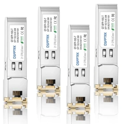QSFPTEK 10GBASE T SFP+ to RJ45 (4Pack), 10G up 30m Copper Mini GBIC Transceiver for Cisco SFP S, Ubiquiti UF , Netgear, Mikrotik, D Link, Supermicro, CAT6A/CAT7, 100FT