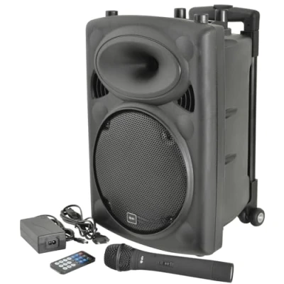 All-in-One Portable PA System – Compact, battery powered speaker with trolley and wheels for easy transport; perfect for events, parties, karaoke, busking, schools, churches, and outdoor performances Wireless Microphone & Bluetooth Streaming | Includes UHF wireless handheld microphone for clear vocals and freedom of movement; built-in Bluetooth lets you easily pair your phone, tablet, or laptop Powerful, Clear Sound Anywhere – 8-inch woofer delivers up to 50W output; TWS stereo pairing allows two units to create a wider, richer soundstage for larger venues or outdoor gatherings Versatile Media Player – Built-in USB, SD card, and FM radio playback with recording function; remote control included for easy track changes and volume control Portable & Long-Lasting – Lightweight, rechargeable battery powered speaker offers up to 8 hours of use; carry handle and built-in trolley make it ideal for mobile DJs, teachers, fitness instructors, or buskers